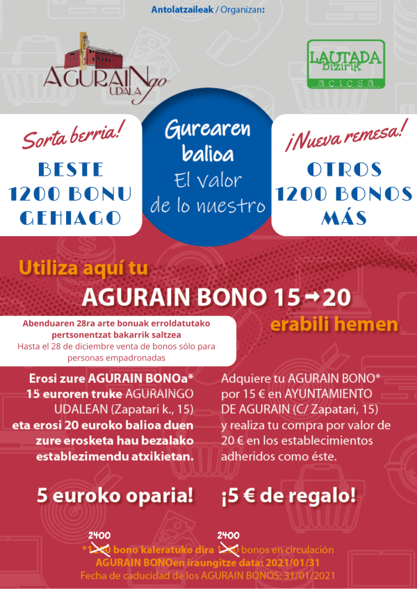 Aguraingo lehen 1.200 bonuak azkar saltzen direnez, Aguraingo Udalak, gure elkartuarekin batera, AGURAIN BONO sorta berri bat kaleratu dugu, udalerriko pertsona gehiagok baliatu ahal izan dezaten ekimen horretaz. Gure herriko merkataritza, ostalaritza eta gainerako zerbitzuak modu arduratsuan suspertu nahi ditugu. Tokiko negozio txikiek Aguraingo kaleetan duten eragin positiboa azpimarratzen eta baloratzen dugu, argia eta bizia... Leer más →