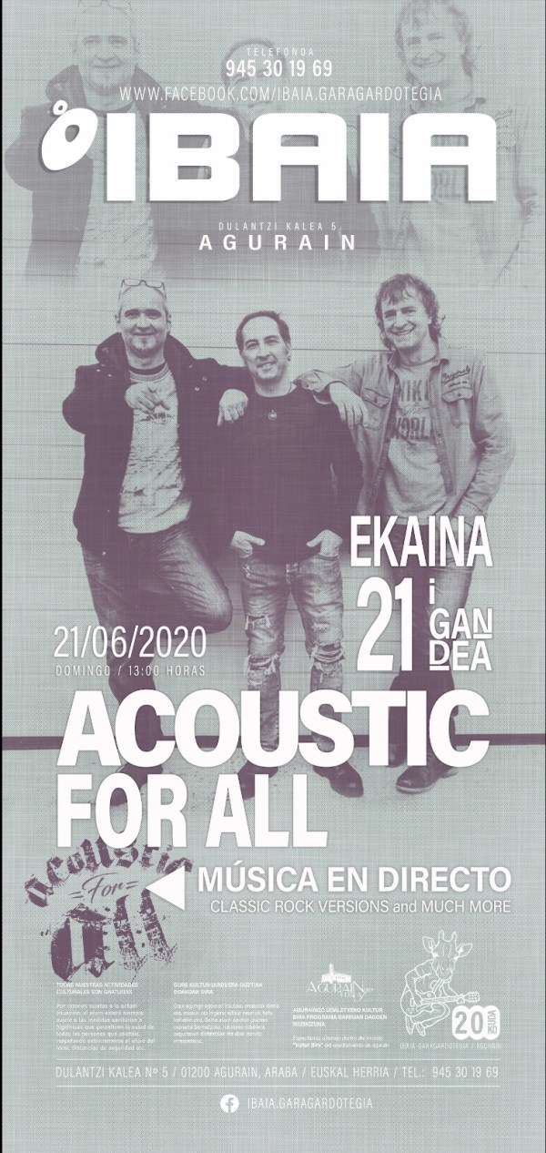 Lugar: Ibaia Garagardotegia (C/ Dulantzi, 5 Agurain) Fecha: domingo 21 de junio Hora: 13:00 Concierto de versiones de rock clásico con el grupo Acoustic For All formado por Roberto Potis, Nacho Martín y Rubén Azkura. Estos incansables moldean en formato acústico grandes éxitos del rock junto con temas propios. Colabora: Ayto. de Agurain