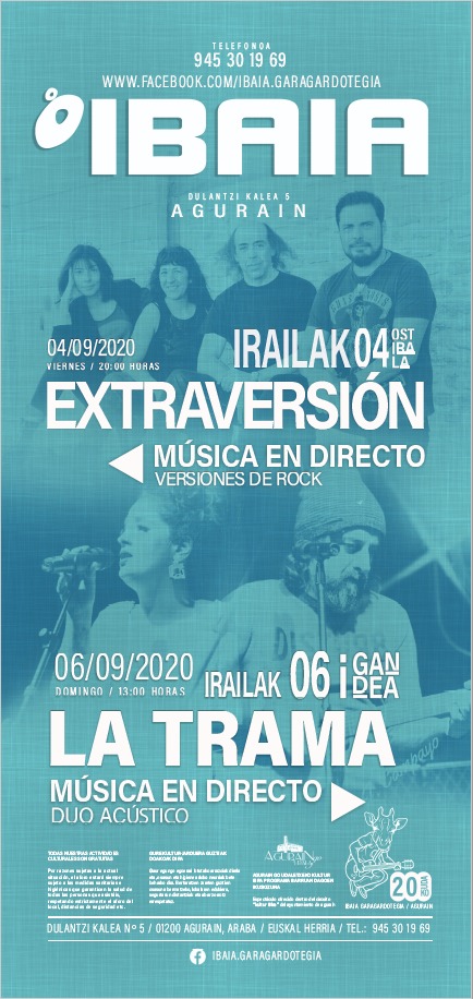 Kontzertu berriak Ibaia Garagardotegian (C/ Dulantzi 5, Agurain) asteburu honetarako, irailaren lehena. Eskerrik asko Ibaiari, garai hauetan musika kultura sustatzen jarraitzeagatik! Han ikusiko dugu elkar! Nuevos conciertos en Ibaia Garagardotegia (C/ Dulantzi, 5 Agurain) para este fin de semana, primero de septiembre. ¡Gracias al Ibaia por seguir fomentando la cultura musical en estos tiempos! ¡Allí... Leer más →
