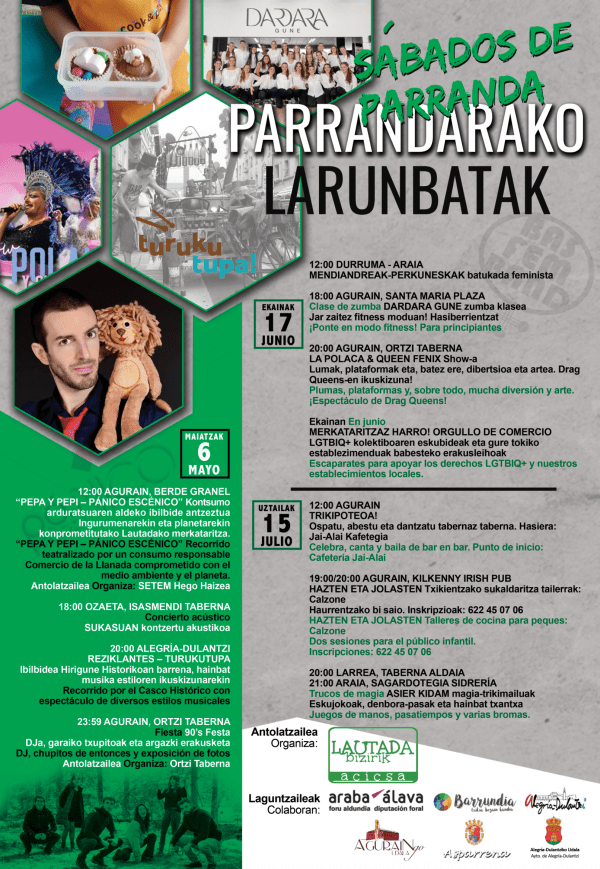 Maiatza, ekaina eta uztaileko 3 larunbatetan hainbat formatutako ikuskizunak, antzerkia, zuzeneko musika eta mota guztietako ikusleei zuzendutako festa eramango ditugu gure establezimenduetara, parrandaz eta jolasaz gozatzeko aukera izango dugularik. 10 jarduera "Parrandarako Larunbatak". Maiatzaren 6an, larunbata, 12:00etan hasiko dira, "Pepa eta Pepi" antzerki-ibilbidearekin, Aguraingo kontsumo arduratsuaren alde. Larunbat arratsaldean bertan, Sukasuan taldearen emanaldia izango da... Leer más →