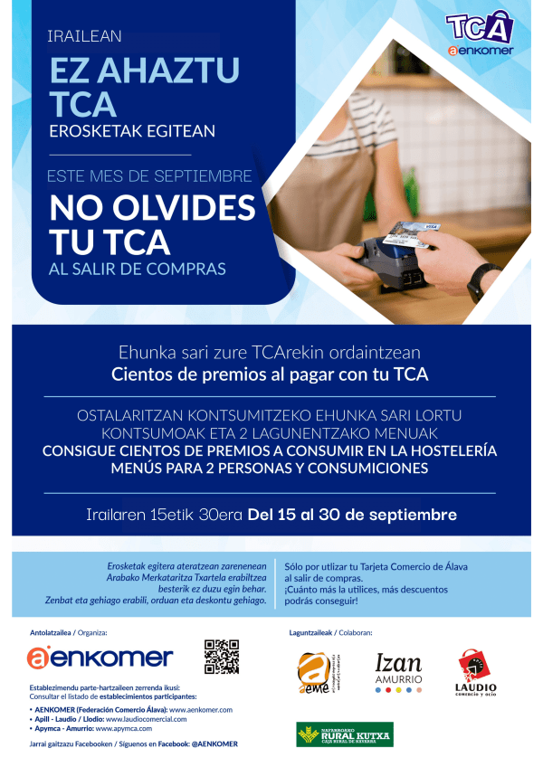 AENKOMER - Arabako Merkataritza eta Zerbitzu Federazioak laguntza ematen dio iraileko azken hamabostaldi honetan ostalaritzaren sektore zigortuari, zure erosketetan Arabako Merkataritzako doako Txartelarekin sarituz. Hain zuzen ere, 10 eurotik gorako erosketa egiten baduzu Arabako Merkataritzako doako Txartelarekin Bergara Zentro Optikon (San Martin k., 6 Agurain) eta Coral-Den Hortz-Klinikan (San Juan Plaza, 5 Agurain), 5 euroko... Leer más →