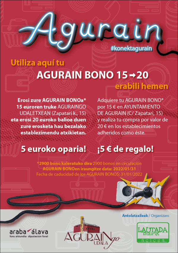 COVID-19aren eraginari aurre egiteko eta tokiko ekonomia suspertzeko, 2021eko azaroaren 22tik aurrera, "AGURAIN BONO" kanpaina berri bat jarriko da abian, merkataritzan, ostalaritzan eta udalerriko gainerako zerbitzuetan kontsumoa eta salmentak sustatzeko. Kanpaina hori Aguraingo Udalaren eta Lautada Bizirik ACICSAren arteko lankidetza-hitzarmenaren esparruan egiten da. Jakin badakigu negozio horiek zeregin garrantzitsua dutela Aguraingo bizitza sozioekonomikoan. AGURAIN BONOaren... Leer más →