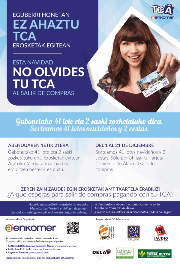 Gabonetako loteak eta saskiak zure doako Arabako Merkataritza Txartelarekin (TCA) 2022ko abenduaren 21era arte Lotes y cestas de Navidad con tu Tarjeta gratuita de Comercio de Álava (TCA) hasta el 21 de diciembre de 2022
