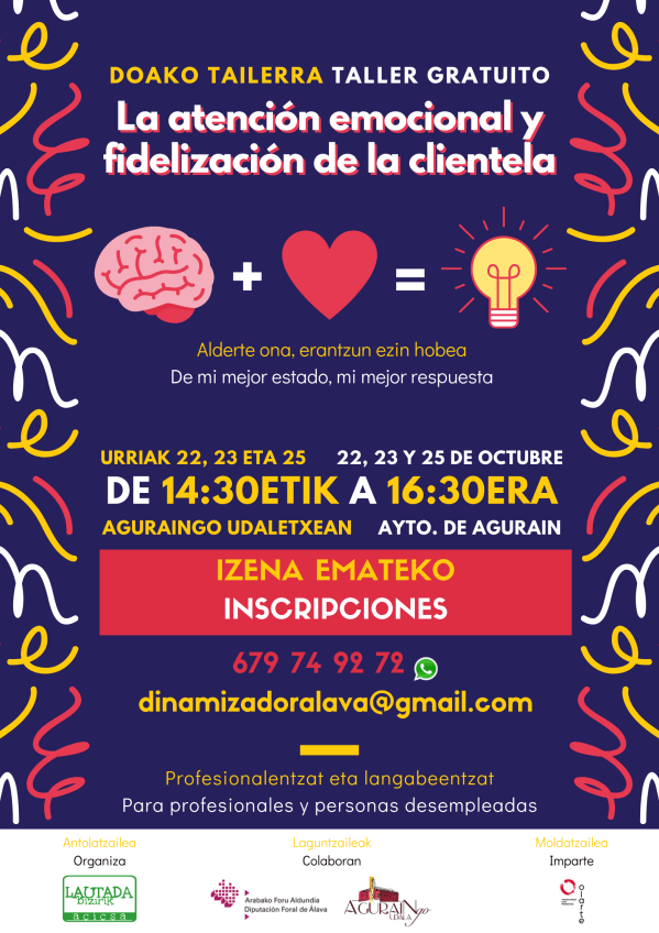 Martes, miércoles y viernes 22, 23 y 25 de octubre de 14:30 a 16:30 h. Sala Manu Yanke (Ayto. de Agurain) En este taller gratuito conocerás las estrategias necesarias para satisfacer e incluso anticiparte a las necesidades y deseos de tu clientela. Te ayudaremos de forma efectiva a canalizar tus esfuerzos hacia tus ventas. Podrás... Leer más →