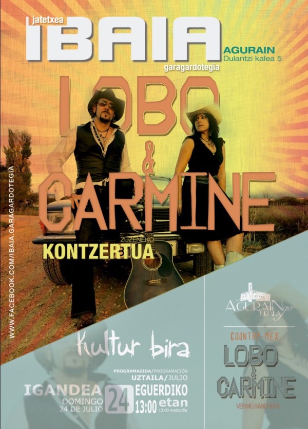 El dúo acústico Lobo & Carmine con aire country-mejicano actuará en Ibaia Garagardotegia (C/ Dulantzi, 5 Agurain) para animarte tu mediodía. https://www.youtube.com/watch?v=vqexqVMnWF8 Tu vermouth del domingo 24 de Julio de 13 a 15 h. estará amenizado con rancheras de la mano de este conocido grupo. ¡No te los puedes perder! Ibaia Garagardotegia, ¡te esperamos!