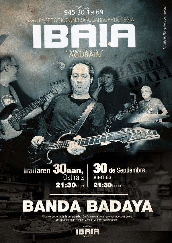El viernes 30 de Septiembre a las 21:30 h., en Ibaia Garagardotegia (C/ Dulantzi, 5 Agurain), concierto prefiestas de la Banda Badaya. https://www.youtube.com/watch?v=wfjhp-OYCmM&list=PL54TJY-K8ORKa5kE8lUamvq1rddmccoOE Esta banda gasteiztarra se formó como un experimento social-musical. Cada miembro de la banda aporta al grupo un "color" diferente a los temas, como el hard-rock, funk, soul, punk y jazz, siendo... Leer más →