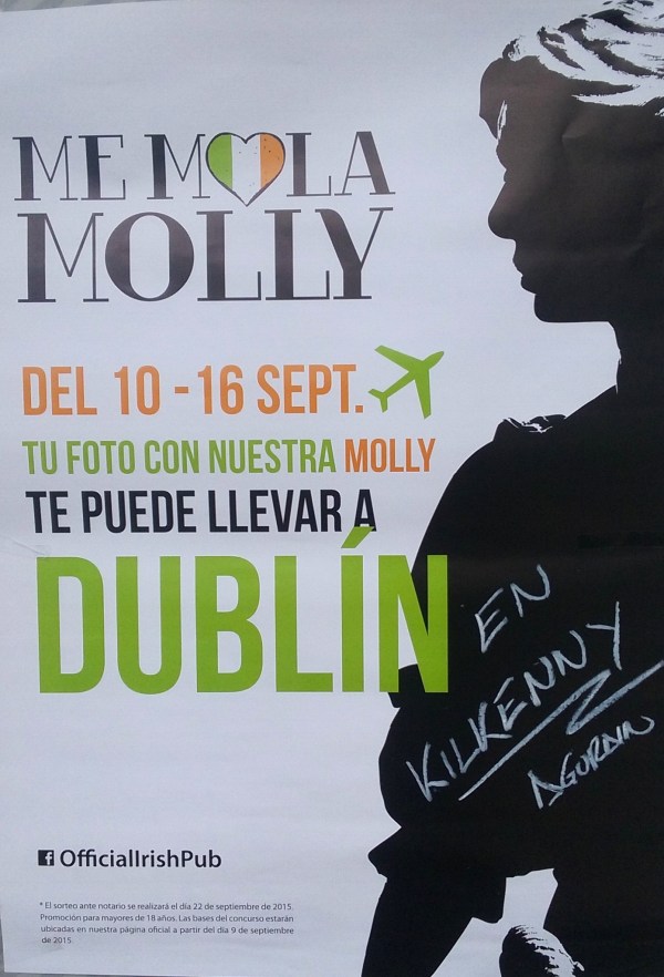 Hasta hoy, miércoles 16 de Septiembre, si vas a Kilkenny Irish Pub (Plaza Euskalherria, 7 Agurain) y "haces oficial que te mola Molly" participarás en un viaje a Dublín para dos personas. Para ganar sólo tienes que hacerte una foto con la "estatua" de Molly Malone con el cartel que hay preparado bajo el anuncio:... Leer más →