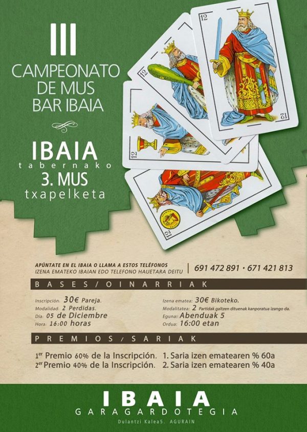 Déjate de fanfarronadas y demuéstralo en el III Campeonato de Mus se disputará el próximo sábado 5 de Diciembre a las 16 h. en Ibaia Garagardotegia (C/ Dulantzi, 5 Agurain). La inscripción es de tan sólo 30 € por pareja y los interesantísimos premios para los finalistas son: Primer premio: 60% de la inscripción. Segundo... Leer más →