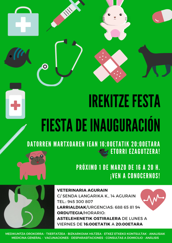 ¡El viernes 1 de marzo llegará el día! Se inaugura una nueva clínica Veterinaria Agurain (C/ Senda Langarika, 14 Agurain), con todo para el cuidado de tus animales. Un día de celebración en el que tú eres protagonista. ¡Te esperamos!