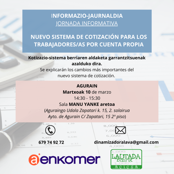 Gobernuak autonomoen kotizazio-sistema berria jarri du abian, haien errendimendu garbien arabera, eta 2023ko urtarrilaren 1ean jarri zen indarrean. Kotizazio-sistema berri hori diru-sarrera errealen arabera zertan datzan, kotizazio-taulak nolakoak diren eta autonomoen erregimen berriaren alderdi giltzarri eta berritasun nagusiak kontatzeko, jardunaldi bat antolatu dugu, AENKOMER Arabako Merkataritza eta Zerbitzu Federazioarekin batera, datorren ostiralean, martxoak 10, 14:30ean,... Leer más →